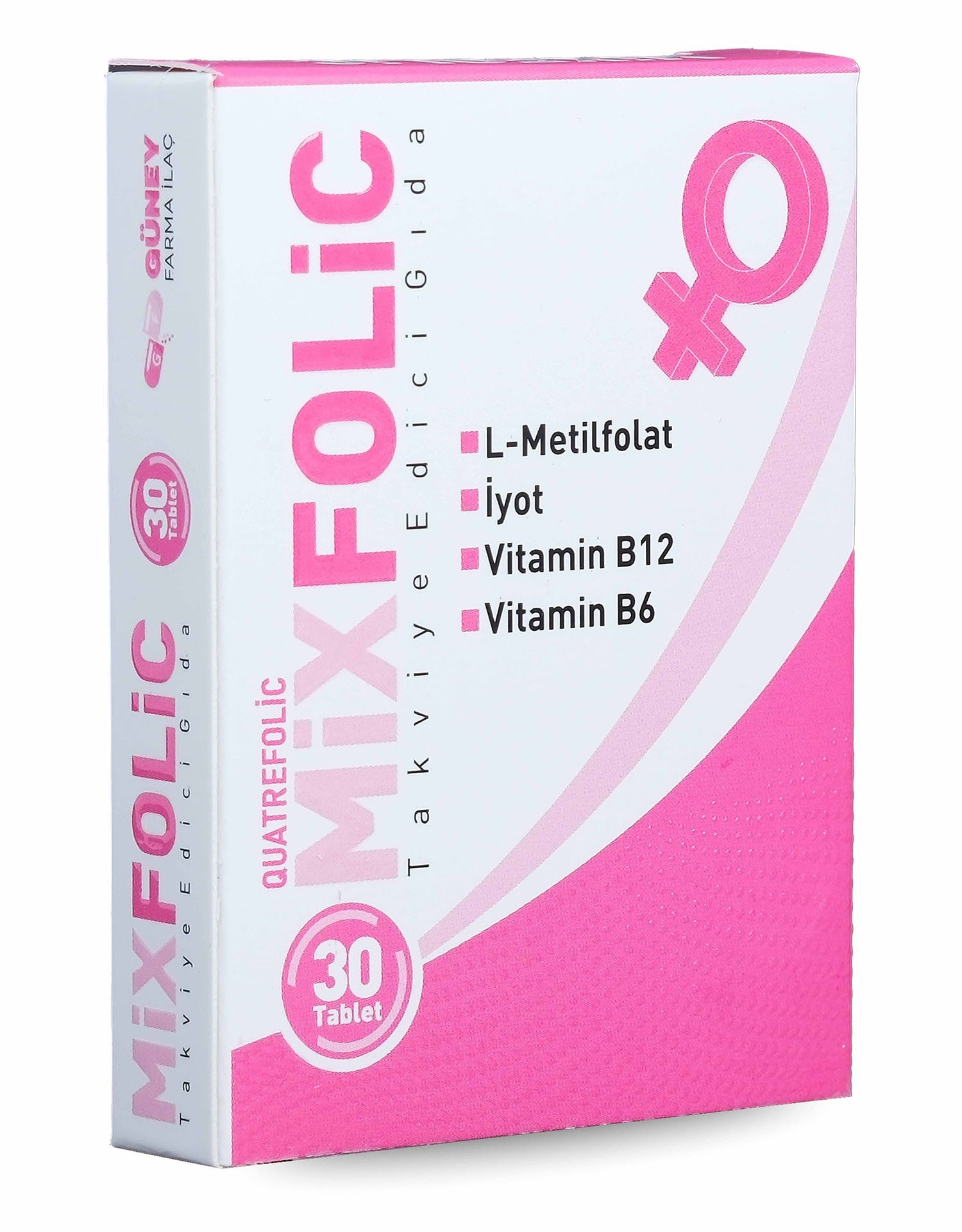Mixfolic tek kutuda 30 tablet bulunan, Vitamin B6,L-Metilfolat,İyot,Vitamin B12 içeren vitamin desteği sağlayan takviye edici gıdadır.Tarım Bakanlığı onayına sahip Mixfolic90 ürününü Güney Farma İlaç satış kanallarından ve eczanelerden güvenle temin edebilirsiniz.